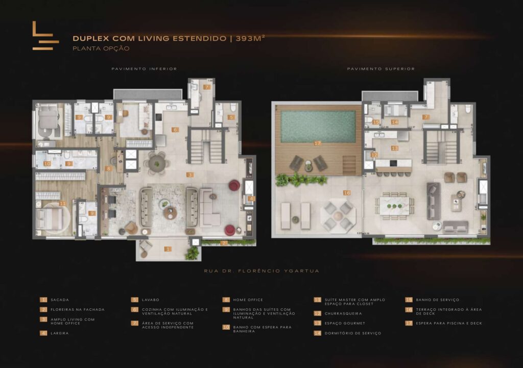 O segundo pavimento oferece uma versão garden de 389 m², com área externa ensolarada – https://azeredoimoveis.com.br/imoveis/ver/3759;