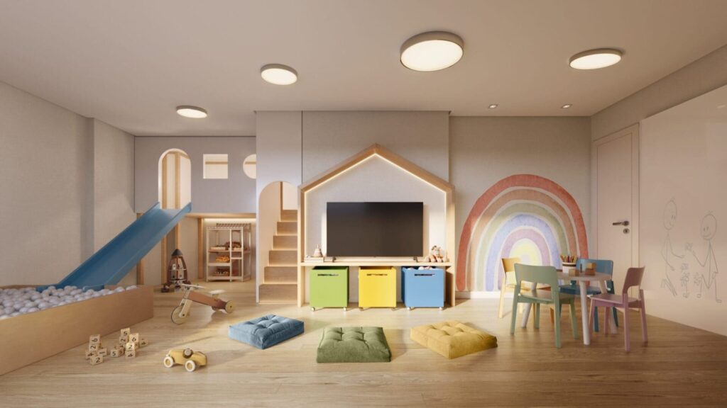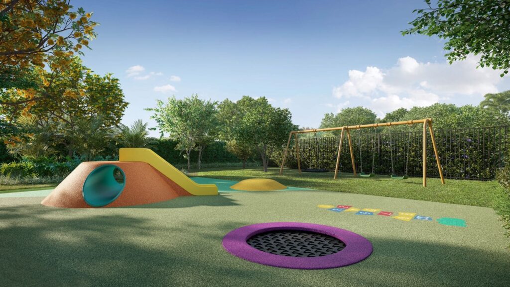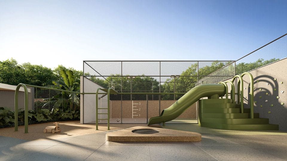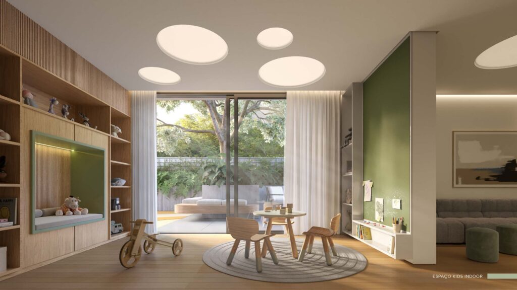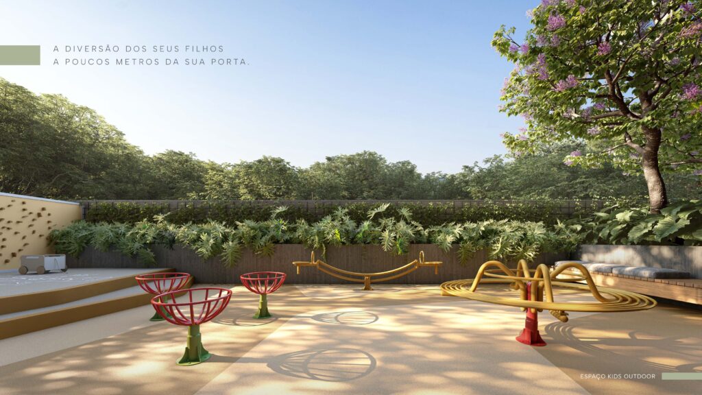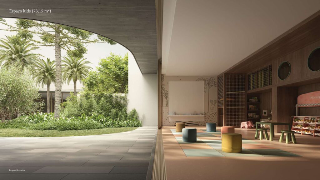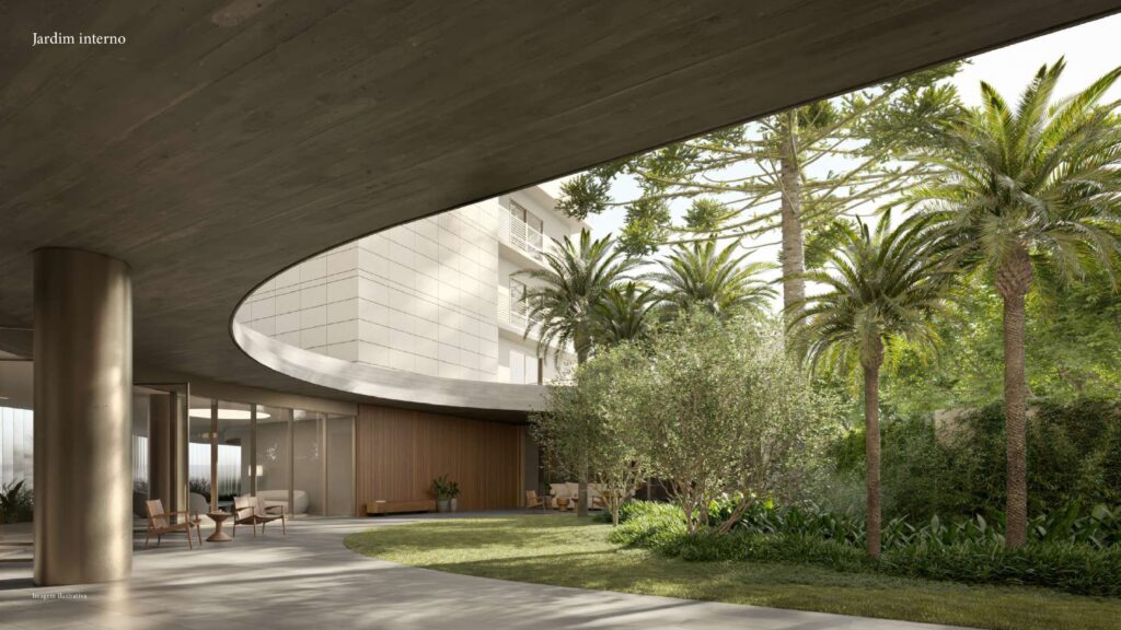 No térreo, um passeio com caminhos sinuosos e pátios abertos alternam momentos de encontro e contemplação. Um amplo jardim central interconecta os espaços de lazer — salão de festas, salão gourmet e espaço kids —, todos integrados ao verde, banhados por luz natural.