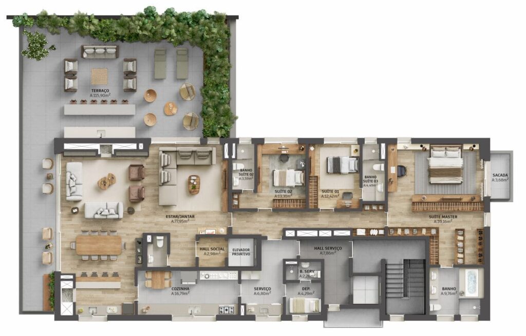 As metragens amplas expressam o novo desejo do público de alto padrão: viver com conforto, espaço e experiências estéticas que dialogam com o bem-estar.